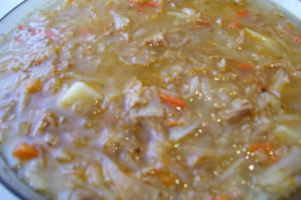 Смак і запах: в міру солоний. Колір: світло-жовтий. Консистенція: однорідна, еластична, овочі м'які зберегли свою форму нарізки. Інструкційна картка На страву: «Капусняк звичайний» Підстава: В.С. Доцяк «Українська кухня», ст. 202 Мета: Навчитися готувати страву «Капусняк звичайний»,з дотриманням якості в роботі, технологічних норм, правил техніки безпеки та вимог санітарії і гігієни. Обладнання, інвентар: обробна дошка, кухарська трійка ножів, електрична плита, виробничий стіл, ложка, шумівка, сковорода. Сировина: капуста, пшоно, картопля, морква, петрушка(корінь), цибуля ріпчаста, жир тваринний, сало шпик, бульйон або вода. Послідовність виконання робіт 1. Відварити бульйон з жирної свинини. 2. Квашену капусту посікти. 3. Додати трохи бульйону. 4. Тушкувати. 5. Моркву, біле коріння, цибулю, дрібно нарізати, пасерувати. 6. Пшоно промити кілька разів теплою водою(40-50 ̊С), а потім гарячою (60-70 ̊ С). Якщо пшоно має гіркість його потрібно обшпарити окропом, а воду злити. 7. У кип'ячий проціджений бульйон покласти нарізану кубиками картоплю. 8. Варити 10-15хв. 9. Додати тушковану капусту. 10. Підготовлене пшоно. 11. Варити до готовності. 12. 12.За 7-10 хв. до завершення варіння покласти сало шпик, розтерте з часником та цибулею з зеленню, пасеровані овочі, сіль, перець, лавровий лист. Набір сировини на 1 порцію