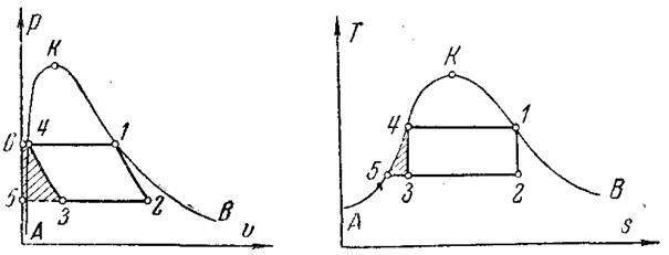 Цикл Карно, осуществляемый насыщенным паром,изображен на Т-s-диаграмме (фиг.). На этих диаграммахкривая АКВ представляет собой пограничную кривую. В том случае, когда рабочим телом является насыщенный пар, изобарический процесс, как известно, является одновременно изотермическим. Процесс 3— 4 соответствует адиабатическому сжатию вкомпрессоре насыщенного пара до его полной конденсации; процесс 4—1— испарению воды в котле до получения сухого насыщенного пара; процесс 1—2—расширению пара в турбине или паровой машине до наинизших температуры и давления цикла; процесс 2—3, который замыкает цикл,— конденсации пара, производимой в специальном конденсаторе. Термический к. п. д. цикла Карно подсчитывается по формуле