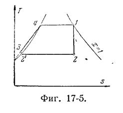 Работа сжатия в цикле Карно может быть значительно уменьшена, если конденсацию перед сжатием доводить до конца, т.е. до точки 5 на схеме цикла (см. выше). Значительное уменьшение работы сжатия при полной конденсации объясняется тем, что жидкость практически несжимаема. А так как удельный объем жидкости, как правило, невелик, то эта работа оказывается небольшой. При адиабатическом сжатии влажного водяного пара от давления 1 до 30 ата, при котором он полностью конденсируется необходимо затратить работу, эквивалентную 455,1 кДж\кг. При адиабатическом сжатии водыот состояния насыщения при1 ата. до давления 30 ата необходимо затратить работу, эквивалентную 2,76 кДж\кг. Таким образом, сжимая полностью сконденсированный пар, можно уменьшить работу сжатия в 165 раз и, следовательно, существенно увеличить. эффективный к. п. д. установки, так как термический к. п. д. при этом уменьшается незначительно. В конце 50-х годов 19-го века такой цикл был предложен шотландским физиком Ренкиным и почти одновременно Клаузиусом. Цикл паросиловой установки с насыщенным паром в координатах Т, s представлен на фиг. 17-5.