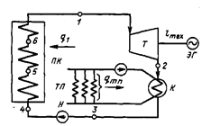 пает к тепловому потребителю ТП. Остальной пар проходит через ЧНД в конденсатор К. Регулируя соотношения пара, проходящего через ЧНД и ТП, можно независимо менять как тепловую, так и электрическую нагрузки турбины с промежуточным отбором, чем и объясняется их широкое распространение на ТЭЦ. При необходимости предусматриваются два и более регулируемых отбора с разными параметрами пара. Наряду с регулируемыми каждая турбина имеет еще несколько нерегулируемых отборов пара, используемых для регенеративного подогрева питательной воды, существенно повышающего термический КПД цикла. Своеобразная «теплофикация» может осуществляться даже на чисто конденсационных станциях, где охлаждающая вода из конденсаторов используется, например, для обогрева бассейнов или водоемов, где искусственно выращивается рыба. Отбросная теплота может использоваться для обогрева парников, теплиц и т. д. Конечно, потребное в районе ТЭЦ количество теплоты для этих целей значительно меньше общего количества отбросной теплоты, но тем не менее такое ее использование является элементом безотходной технологии — технологии будущего. Несмотря на большие потери при передаче теплоты от продуктов сгорания в паровом котле к пару, КПД паросиловых установок в среднем выше, чем у ГТУ, и близок к КПД ДВС Большой располагаемый теплоперепад в турбине и связанный с этим относительно низкий удельный расход пара на выработку 1 кВт позволяют создать паровые турбины на колоссальные мощности — до 1200 МВт в одном агрегате. Поэтому паросиловые установки безраздельно господствуют как на тепловых, так и на атомных электростанциях. Паровые турбины применяют также для привода турбовоздуходувок (в частности, в доменном производстве). Недостаток паротурбинных установок — большие затраты металла, связанные прежде всего с большой массой котлоагрегата. Поэтому они практически не применяются на транспорте и их не делают маломощными.