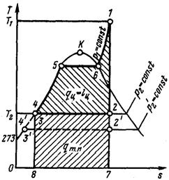 На фиг. 6.12 приведена схема теплофикационной установки, где показано, что охлаждающая вода, нагретая в конденсаторе К, не сбрасывается, а поступает в отопительные приборы потребителя. Температура воды для отопления должна быть не ниже 70—100 °С. Температура пара в конденсаторе (подогревателе) должна быть хотя бы на 10—15 0С выше. В большинстве случаев она получается больше 100 0С, а давление насыщенного пара p2 при этой температуре выше атмосферного. Поэтому турбины, работающие по такой схеме, называются турбинами с противодавлением. Итак, давление за турбиной с противодавлением получается обычно не менее 0,1—0,15 МПа вместо около 0,004 за конденсационной турбиной, что, конечно, приводит к уменьшению работы пара в турбине и соответствующему увеличению количества отбросной теплоты. Это видно на рис. 6.13, где полезно использованная теплота qц в конденсационном цикле изображается площадью 1-2'-3'-4'-5-6-1, а при противодавлении — площадью 1-2-3-4-5-6-1. Площадь 2-2'-3'-4 дает уменьшение полезной работы из-за повышения давления за турбиной с р'2 до р2. Повышение противодавления (конечного давления пара) приводит к уменьшению выработки механической или электрической энергии, но общее использование тепла при этом значительно повышается. Для идеального случая, в котором не учитываются неизбежные потери, коэфициент использования тепла в комбинированном процессе равен единице. В действительных условиях часть тепла теряется, и экономичность теплофикационных установок достигает 70—75%. Недостатком приведенной схемы является то, что отбор пара жёстко связан с его расходом через турбину. На практике потребности в электроэнергии и теплоте во времени не совпадают. Чтобы избавиться от такой жесткой связи, на станциях широко применяют турбины с регулируемым промежуточным отбором пара (рис. 6.14). Такая турбина состоит из двух частей: части высокого давления (ЧВД), в которой пар расширяется до давления pотб, необходимого для теплового потребителя, и части низкого давления (ЧНД), где пар расширяется до давления р2 в конденсаторе. Через ЧВД проходит весь пар, вырабатываемый котлоагрегатом. Часть его (при давление ротб) отбирается и посту-