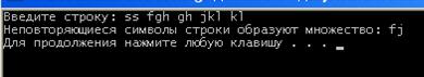 Пример 75. Поиск множества неповторяющихся символов строки int main() { SetConsoleOutputCP(1251); char st[80]; int i,j,flag,len; printf("Введите строку: "); gets(st); len=strlen(st); //длина строки printf("Неповторяющиеся символы строки образуют множество: "); for (i=1; i<len; i++) { flag=0; //флаг проверки на совпадение for (j=0; j<i; j++) //сравнение символа с предыдущими if (st[i]==st[j]) flag=1; for (j=i+1; j<len; j++) //сравнение символа с последующими if (st[i]==st[j]) flag=1; if (flag==0) printf("%c", st[i]); } cout<<'\n'; system("pause"); return 0; } Результат выполнения программы: