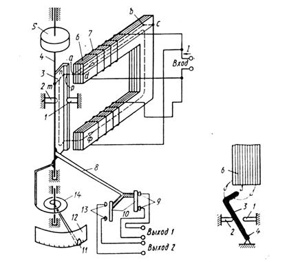 Так как Хорошими возможностями согласования характеристик обладает электромагнитная система с поворотным якорем, кинематическая схема которого представлена на рис.13.3. Якорь Г-образной формы выполнен из тонкой электротехнической стали. С уменьшением зазора он насыщается, Помимо указанных факторов на коэффициент возврата реле оказывают влияние трение перемещающихся частей электромагнита и гистерезис материала магнитопровода. За счёт их действия коэффициент возврата уменьшается. Для уменьшения влияния трения на коэффициент возврата усилие противодействующей пружины должно значительно превышать силу трения. Конструкцию и принцип действия реле рассмотрим на примере реле максимального тока, кинематическая схема которого приведена на рис.13.3 (а и б). На шихтованном магнитопроводе 6 П-образной формы расположены две намагничивающие обмотки 7, при протекании тока по которым создаётся магнитный поток Таким образом, если ток достигает тока срабатывания, якорь повернется до упора 1. С якорем жестко связаны посредством контактного рычага 8 два подвижных контактных мостика 10. При срабатывании в начале поворота якоря разомкнутся контакты 9 (выход 1), а в конце поворота якоря замкнутся контакты 13 (выход 2). При токе возврата происходит поворот якоря в обратном направлении и коммутация контактов в обратной последовательности – размыкания контактов 13 и последующее замыкание контактов 9. Для согласования механической и тяговой характеристик используются упоры 1 и 2. Оптимальное согласование характеристик осуществляется изменением положения упоров. Изменение уставки тока срабатывания осуществляется: грубое (изменение в два раза) – путем различного (последовательного и параллельного) соединения обмоток 7 (на рис.13.3 они соединены параллельно); плавное – осуществляется путем перемещения указателя уставки 11 по шкале уставок 12. Указатель уставки 11 соединен с пружиной 14 и при движении указателя пружина закручивается или ослабляется, поднимая или опуская тем самым механическую характеристику. Данное реле может работать как на постоянном, так и на переменном токе. Для устранения вибраций якоря, возникающих на переменном токе, применяется гаситель колебаний 5, в котором энергия колебаний затрачивается на работу трения песчинок. Гаситель колебаний (демпфер) 5 устраняет и вибрации контактов при включении (дребезг контактов). Общий вид реле серии РТ-40 представлен на рис.3. На базе реле РТ-40 разработаны реле напряжения серии РН-50. Они отличаются от реле тока следующим: 1. обмоточными данными - большим числом витков обмоток с меньшим поперечным сечением провода обмоток, 2. отсутствием гасителя колебаний 5. Так как ток в обмотках относительно невелик, то для уменьшения вибраций якоря применяется выпрямительная схема. В настоящее время промышленностью выпускаются реле напряжения серии РН и реле тока серии РТ, основные данные которых приведены ниже.