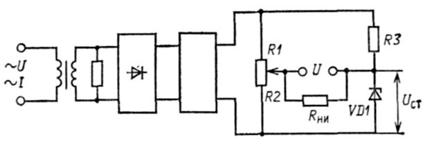 Рис. 15.8. Структурная схема реле напряжения При больших выдержках времени погрешность реле возрастает, так как экспонента становится пологой. Этим ограничивается выдержка времени таких реле. Для повышения точности заряд конденсатора производят через токостабилизирующее устройство.Схема реле и процесс заряда конденсатора показаны на рис. 15.9. Поскольку напряжение на базе транзистора стабилизировано, то коллекторный ток не зависит от напряжения на коллекторе (генератор тока). Ток заряда устанавливается резистором R1. Чем больше ток заряда, тем меньше выдержка времени. Стабилитрон VD делает неизменным напряжение на резисторе R1, что позволяет получить постоянное время срабатывания при данном положении движка потенциометра.