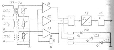 Рис. 15.1. Измерительный орган со стабилитроном 2) проявление физического эффекта, возникающего при определенном значении измеряемого напряжения, — скачок в нелинейной характеристике туннельного диода, релейная характеристика триггера Шмидта и др.; 3)преобразование непрерывного входного сигнала и опорного напряжения в цифровую форму. После этого производится сравнение входного сигнала с опорным напряжением. Обработка входного сигнала в цифровой форме может производиться по требуемому алгоритму вычислительного устройства. Последний принцип наиболее перспективен ввиду высокой универсальности и развития вычислительной техники. Функциональная схема трехфазного полупроводникового реле тока представлена на рис. 15.2. Пропорциональные токам напряжения трех фаз подводятся к промежуточным трансформаторам Т1 — ТЗ. Между первичной и вторичной обмотками установлен экран. На выходе трансформаторов включены нелинейные резисторы. Эти мероприятия защищают усилители ОУ от перенапряжений. Сигнал со вторичных обмоток трансформаторов, пропорциональный контролируемому току, подается на входы ОУ А1 — A3. На эти же усилители подается опорное напряжение с резистора R. Входные и опорные напряжения сравнива