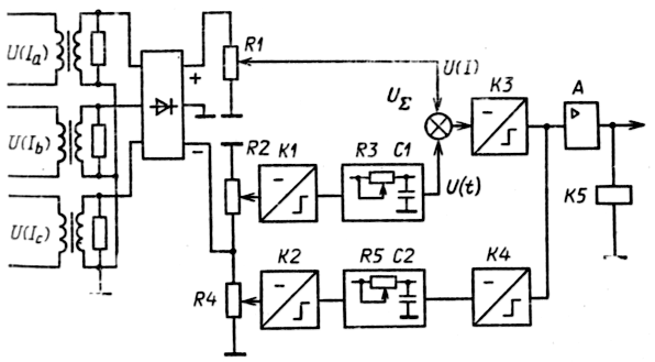 б) Реле тока с выдержкой времени, зависящей от тока. В таких реле используются и аналоговые, и дискретные схемы. На рис. 15.4 в качестве примера показана функциональная схема полупроводникового токового расцепителя автоматического выключателя серии «Электрон». Напряжения, пропорциональные токам в фазах, через промежуточные трансформаторы подаются на выпрямитель, после чего поступают на резисторы Rl, R2, R4. Пропорциональный току сигнал И (I) с Rl подается на суммирующий блок в) Реле защиты от замыканий на землю. Реле применяется в схемах защиты при замыканиях на землю генераторов, двигателей и линий с малыми токами замыкания на землю. Основные параметры реле: ток срабатывания j регулируется в пределах 0,02—0,12 А; коэффициент возвврата не менее 0,93; коммутируемое напряжение не более 250 В; механическая износостойкость 104 циклов; электрическая износостойкость не менее 103 циклов.