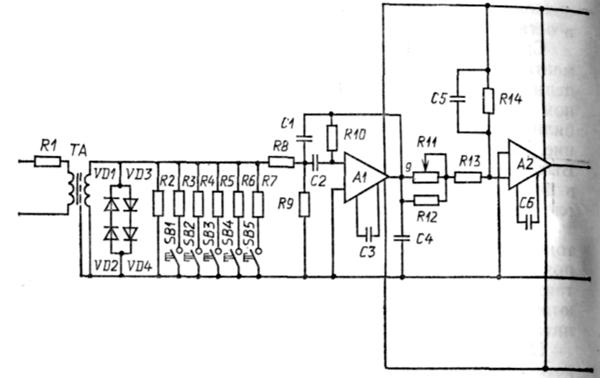 Рис. 15.4. Полупроводниковый расцепитель для управления автоматическим выключателем серии «Электрон» Схема реле представлена на рис. 15.5. Измерительный орган реле содержит промежуточный трансформатор ТА и резисторы R2 — R7, которые вместе с выключателями SB1 — SB5 служат для дискретной регулировки тока срабатывания. При отключенных выключателях ток срабатывания реле минимален. По мере включения R3—R7 уменьшается напряжение на выходе операционного усилителя А1. и ток срабатывания увеличивается. Диоды VD1 — VD4 служат для ограничения сигнала на входе А1. При большом входном сигнале трансформатор ТА насыщается и его входное сопротивление падает. Резистор R1 ограничивает ток в цепи трансформатора, ТА. Операционный усилитель А1 работает как активный фильтр. Многоконтурная отрицательная обратная связь с помощью резисторов R8, R9, R10 и конденсаторов CI, C2 позволяет отфильтровать высшие гармоники в сигнале и оставить основную частоту 50 Гц. Сравнивающая часть реле состоит из порогового элемента на операционном усилителе А2, время-измерительной цепи. VD5, R15, R16, С8 и триггера Шмидта на операционном усилителе A3. Конденсаторы СЗ—С10 служат для стабилизации работы усилителя, исключая его самовозбуждение. Резистор R17 создает положительную обратную связь. Выходной каскад реле выполнен на транзисторе VT1, в цепь коллектора которого включено быстродействующее электромагнитное реле К. Питание схемы осуществляется от сети постоянного тока (контакты 4, 1 при напряжении 220 В и 4, 2 при напряжении 110 В) или от сети переменного тока 100 В (контакты 4, 3). С помощью стабилитронов VD6 и VD7 получаются два симметричных напряжения —15 В и +15 В для питания операционных усилителей. Порог срабатывания порогового элемента определяется резисторами R11—R14. Настройка реле на минимальную уставку производится резистором R11.