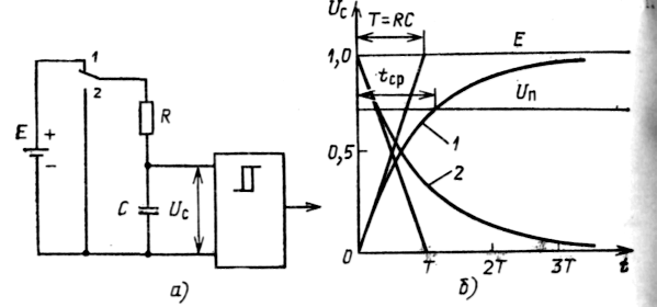 Рис. 15.9. Полупроводниковое реле времени: в — принципиальная схема; б — процессы заряда / и разряда 2 конденсатора С целью увеличения выдержки времени можно использовать заряд конденсатора от источника импульсного напряжения. При каждом импульсе напряжение на конденсаторе поднимается на небольшую величину, после чего во время паузы остается неизменным. Такое реле позволяет увеличить выдержку времени. Дело в том, что во время паузы напряжение на емкости не меняется и это ж) Цифровые реле времени. В цифровом реле времени управляющее устройство запускает генератор. Импульсы от генератора подаются на вход не-синхронизируемого двоичного счетчика. В момент совпадения кода времени с заданной уставкой сигнал дешифратора скачкообразно меняется и выходной импульс подается на усилители. После каждого цикла счетчик переводится в нуль. Приведенная погрешность описанных реле времени не превышает 5 %. Коммутационная износостойкость составляет не менее 4*106 циклов.