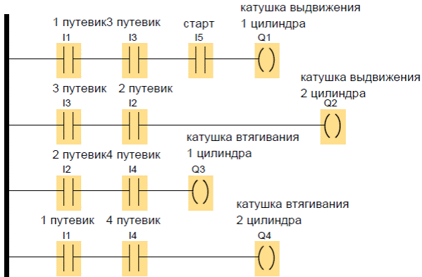 Другая взаимосвязь работы ПЦ А и В: по сигналу от кнопки «старт» S5 срабатывает шток ПЦ А и ждёт когда отработает свой цикл ПЦ В, после чего совершает обратный ход ПЦ А. Контроль за положением штоков осуществляется ПВ S1,S2, S3 и S4). Особенность этой циклограммы состоит в том, что здесь два шага 2-ой и 4-ый выполняются по одинаковым логическим условиям S2 и S3, что нарушит работоспособность ЭПСУ.