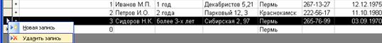 ■ Для удаления лишних строк (если таковые вдруг появились) или вставки новой строки: - Щелкаем правой клавишей мыши по полю слева от удаляемой строки. Строка должна выделиться, появляется контекстное меню. Выбираем пункт «Удалить запись»: