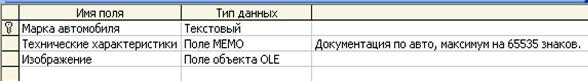 Сохраняем, выходим из таблицы. 5. Создаем таблицу «Автомобили»: ■ Поле «Марка автомобиля»- текстовое, размер- 15 символов, ключевое поле. ■ Поле «Технические характеристики». Тип- поле Memo. В столбце «Описание» напишем: документация по авто, максимум на 65535 знаков. ■ Поле «Изображение». Тип- поле объекта Ole. В него будем вставлять картинки. Все, сохраняем и закрываем конструктор таблицы «Автомобили»: