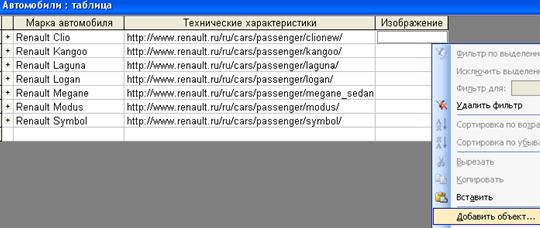 ■ Открываем таблицу для заполнения (двойным щелчком, или кнопкой «Открыть») ■ Заполняем столбцы «Марка автомобиля» (Clio, Kangoo, Laguna, Logan, Megane, Modus, Symbol), «Технические характеристики» (здесь укажем только ссылки на официальный сайт Рено); ■ Столбец «Изображение». Щелкаем правой клавишей мыши в первой строке поля «Изображение», выбираем пункт «Добавить объект»: