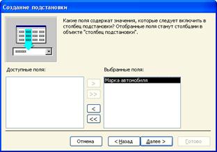 6. Создадим таблицу «Поставки»: ■ Поле «Номер поставки», тип- числовой, размер- целый, это ключевое поле таблицы. ■ Поле «Марка автомобиля», тип- текстовый, размер- 20. Виды автомобилей будем выбирать из списка (закупаем только те марки, которые упомянуты в таблице «Автомобили») Таблица «Автомобили» может изменяться, столбец подстановки будет так же динамично ему соответствовать. Создадим подстановку: тип «текстовый» меняем на «мастер подстановок», выбираем «объект будет использовать значения из таблицы или запроса», далее выбираем таблицу «Автомобили», далее, в столбец «выбранные поля» переносим поле «марка автомобиля» (кнопкой