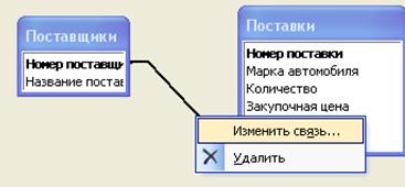 Установка связей между таблицами 1. Вызываем окно схемы данных: На панели инструментов щелкаем по кнопке ■ Из за ряда используемых подстановок таблицы уже связаны между собой. Разместите таблицы на схеме, как вам удобно (перетаскивая их за заголовки), проследите, что бы были видны все их поля (если не видны- двойной стрелкой «удлините» таблицы снизу). ■ Для добавления таблиц на схему используйте кнопку 2. Изменим типы связей между таблицами. Для этого щелкаем правой клавишей мыши на схеме данных по линии связи, появится небольшое окно с двумя пунктами: «Изменить связь» и «Удалить»:
