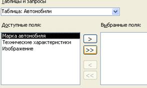 ■ Проверьте, из списка «Таблицы и запросы» должна быть выбрана таблица «Автомобили». Из столбца «Доступные поля» в столбец «Выбранные поля» переносим названия только тех полей, которые мы хотим отобразить на форме (рис. 28)