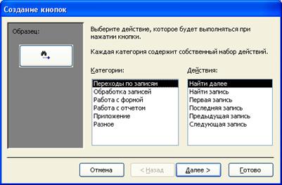■ Выделите все объекты одной рамкой и перенесите их пониже. Зайдите в меню Вид/ Панель элементов. Нажмите на кнопку Аа (Надпись) и сделайте заголовок для формы: «Автомобили концерна Renault». Цвет, стиль, размер шрифта задайте сами, какие нравятся (это относится не только к заголовку, но и к надписям «Марка автомобиля», «Технические характеристики», «Изображения»). Расположите поля на форме в удобных для вас местах. С помощью панели инструментов можно задать стиль надписей и полей (приподнятый, утопленный, рельефный и пр.) Что бы посмотреть, что получается, попеременно заходите то в режим формы, то в режим конструктора. Это можно сделать используя пункт меню Вид / Режим конструктора (Вид/ Режим формы), или через кнопку с панели инструментов, дублирующую операции меню «Вид» (крайне левая кнопка). ■ В режиме конструктора добавим на форму 4 кнопки: “ < ” и ” > ” (для пролистывания записей), “Поиск” и “Вернуться к главному меню”. Для этого: - С панели элементов выбираем компонент «Кнопка», помещаем ее на форму. Откроется окно: