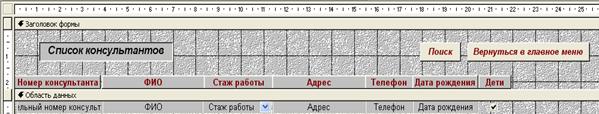 «Найти далее». Нашли? Получите теперь информацию об автомобиле «Megane». ■ Закройте форму кнопкой «Вернуться к главному меню». 2. Создадим форму для таблицы «Консультанты»: ■ Откройте вкладку «Формы», нажмите «Создать». В окне «Новая форма» выберите пункт «Мастер форм», а в строке «Выделите в качестве источника данных таблицу или запрос» выберите таблицу «Консультанты». «ОК». ■ из списка «Таблицы и запросы» должна быть выбрана таблица «Консультанты». Из столбца «Доступные поля» в столбец «Выбранные поля» переносим все поля. ■ «Далее», выбираем внешний вид формы: ленточный, «Далее», выбираем стиль (любой, какой вам понравится), «Далее», задайте имя формы- Список консультантов, «Готово». ■ Перейдите в режим конструктора, откорректируйте внешний вид формы, расположите на ней заголовок и две кнопки (так же, как и на форме «Автомобили концерна Renault»)