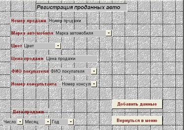 Рис. 35 Форма «Поставки» ■ Кнопка «Добавить данные» создана следующим образом: с панели элементов берем элемент «Кнопка», выбираем у нее категорию- «Обработка записей», Действия- «Добавить запись». Далее. Выбираем пункт «текст», записываем «Добавить данные». Далее. Готово. ■ Кнопка «Вернуться в меню» создана так: с панели элементов берем элемент «Кнопка», выбираем у нее категорию- «Работа с формой», Действия- «Закрыть форму». Далее. Выбираем пункт «текст», записываем «Вернуться в меню». Далее. Готово. ■ Сохраняем. Форму пока оставляем пустой. 6. Создаем форму «Регистрация проданных авто» для таблицы «Продажи»: ■ Откройте вкладку «Формы», нажмите «Создать». В окне «Новая форма» выберите пункт «Мастер форм», а в строке «Выделите в качестве источника данных таблицу или запрос» выберите таблицу «Продажи». «ОК». ■ Из столбца «Доступные поля» в столбец «Выбранные поля» переносим всё. «Далее». ■ Выбираем внешний вид формы: в один столбец, «Далее», выбираем стиль, «Далее», задайте имя формы- Регистрация проданных авто, «Готово». ■ В режиме конструктора проводим некоторые оформительские работы, например: