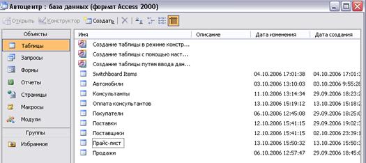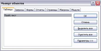 Рис. 73 Импорт таблицы «Прайс-лист» ■ Видим, что из этой базы можно импортировать таблицы, запросы, формы, отчеты, страницы, макросы и модули. Но база «Продажа запчастей» содержит только одну таблицу «Прайс-лист», ее и импортируем. ОК. ■ Просмотрите список таблиц базы- теперь он пополнился таблицей «Прайс-лист»:
