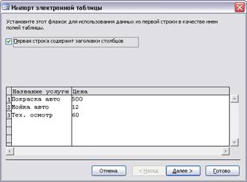 Рис. 74 Перечень таблиц БД «Автоцентр» 2. Импортируем данные из электронной таблицы Excel: ■ Пункт меню «Файл»/ «Внешние данные»/ «Импорт». ■ Выберите тип файла, который мы хотим импортировать: MS Office Excel и найдите файл «Услуги салона» (он в той же папке, что и база «Продажа запчастей»). ■ «Импорт». Возникнет окно: