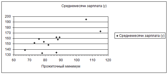 С целью повышения эффективности решения задачи необходимо воспользоваться возможностями ППП Ехсеl. Для этого требуется инициировать опцию Мастер функций. В основном будет востребована категория Статистические и некоторые функции из категорий Математические и Ссылки и массивы. Перечень этих функций и краткое описание представлены в Приложении «Стандартные функции». ВНИМАНИЕ! Каждый студент должен выполнить индивидуальное задание с использованием компьютера в двух вариантах: 1) Реализовать формулы (1.1) – (1.15) с помощью ППП Ехсеl. 2) Использовать «комплексные» функции, выходом которых являются не только коэффициенты регрессии, но и дополнительная регрессионная статистика (среднеквадратические отклонения, коэффициент детерминации и т.д.). 1) Реализация регрессионных формул (1.1) – (1.15). В начале необходимо воспользоваться Мастером диаграмм, выбрать тип Точечная и нанести значения выборки на корреляционное поле (рис. 1.1). По расположению точек на графике сделать предварительный анализ о возможной линейной зависимости между переменными. С помощью функций ППП Ехсеl определить оценки коэффициентов регрессии b 0, b 1, реализуя формулы (1.7), (1.8), например По соответствующим формулам вычисляются дисперсии