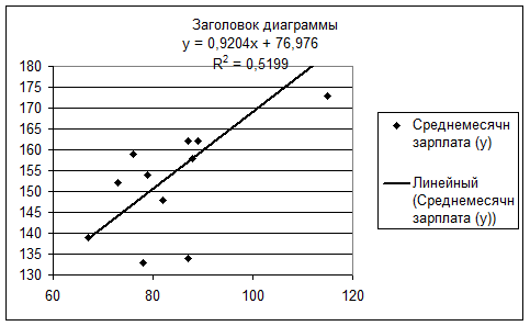 Примерный вид реализации задачи на компьютере представлен на рис.1.2. Для графической иллюстрации приближения корреляционной функции Параметры линейной регрессии можно рассчитать и сразу. Для этого в Ехсеl существуют функции Наклон и Отрезок. Функция Наклон служит для определения углового коэффициента связи (b 1), а функция Отрезок – для определения свободного члена уравнения (b 0). В качестве аргументов этих функций вводятся массивы Х и Y. Кроме перечисленных возможностей существует еще и следующая возможность. Построим график по имеющимся данным. Чтобы ось Х отражала фактические данные, выберем тип диаграммы Точечная. На построенной диаграмме выделим график функции, щелкнув по ней левой кнопкой мыши. Затем нажмем правую кнопку мыши, выведем контекстное зависимое меню, в котором выберем опцию Добавить линию тренда. В панели линии тренда во вкладке Тип надо выбрать тип функции (по умолчанию выбирается Линейная). Во вкладке Параметры введем название тренда (теоретической кривой) и установим флажки «Показывать уравнение на диаграмме» и «Поместить на диаграмму величину достоверности аппроксимации (R^2)». В результате появится график вида (рис.1.4.).