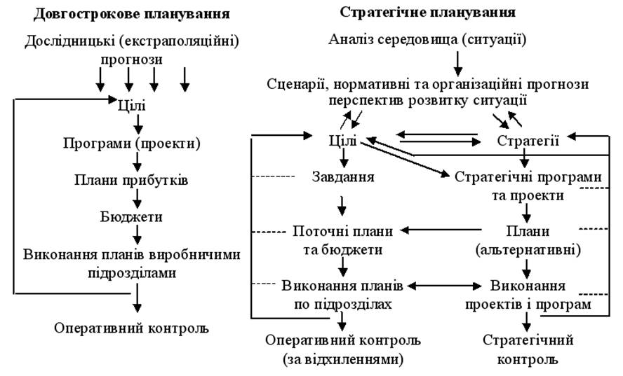 Рис.1.2. Порівняльна характеристика довгострокового та стратегічного планування [3] Стратегічний аналіз середовища підприємства створює підвалини для прогнозування можливостей розвитку ситуації. У стратегічному плануванні широко застосовуються сценарії, планування «портфеля підприємства», широкий арсенал методів маркетингу та планування. Вінцем розвитку стратегічного планування стала система «планування, програмування, бюджетування», що широко використовувалась у найбільш досконалому вигляді у Пентагоні. Дуже близька до неї система «прогноз — програма — план», що почала впроваджуватись у СРСР після 1979 р. згідно з Постановою ЦК КПРС і РМ СРСР № 695. Планування набирало все більш органічної форми з орієнтацією на визначення цілей (з ринковими та «виробничими» характеристиками) та альтернативні заходи щодо їхнього досягнення; перехід на «запасні», підготовлені варіанти вже не сприймається як порушення «нормального перебігу подій»; успіх визначає досягнення комплексу соціально-економічних чинників, встановлених як критерії на довгостроковий період. Застосування стратегічного планування зумовило необхідність інтеграції різних видів планової діяльності, що здійснювались всіма підсистемами підприємства, а також потребу подальшого розвитку стратегічної діяльності на підприємстві, оформленої у вигляді системи стратегічного управління. Стратегічне управління. У травні 1971 р. у Піттсбурзі (США) було проведено розширену конференцію з питань стратегічного управління, де в 14 розгорнених доповідях було підбито підсумки розвитку стратегічного підходу в управлінні західними та східними компаніями, а також визначено основні напрямки розвитку стратегічного управління. 1973-й рік вважається початком регулярного теоретичного дослідження та практичного впровадження стратегічного управління. Відтоді цей напрямок у теорії та практиці управління продовжує розвиватися, дослідження в цій галузі проводяться в усьому світі, більшість процвітаючих організацій досягли своїх результатів завдяки впровадженню системи стратегічного управління. Так, більшість корпорацій США та Західної Європи мають кваліфікований персонал, що пройшов спеціальну підготовку зі стратегічного управління. З цього часу відбувся розподіл між поточним та стратегічним управлінням, почали закладатися основи його розвитку. Будь-який тип управління базується на відповідній концепції. Концепція управління — це система ідей, принципів, уявлень, що зумовлюють мету функціонування організації, механізми взаємодії суб’єкта та об’єкта управління, характер відносин між окремими ланками його внутрішньої структури, а також урахування впливу зовнішнього середовища на розвиток підприємства. Вихідною ідеєю, що відображає сутність концепції стратегічного управління, є ідея необхідності врахування взаємозв’язку та взаємовпливу зовнішнього та внутрішнього середовища при визначенні цілей підприємства. Стратегії в цьому випадку виступають як інструменти досягнення цілей, а для реалізації стратегій необхідно, щоб усе підприємство функціонувало у стратегічному режимі. Виходячи з цього, стратегічне управління — це реалізація концепції, в якій поєднуються цільовий та інтегральний підходи до діяльності підприємства, що дає змогу встановлювати цілі розви