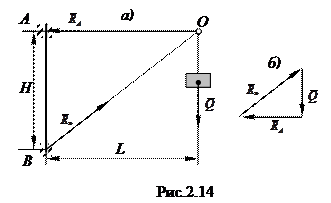 Теперь можно считать, что на тело действуют две силы уравновешенную систему, если направлены по общей линии действия в разные стороны. Следовательно, линия действия силы Уравновешенная система из трех сил представляет собой замкнутый треугольник (рис. 2.13, б). Зная три элемента этого треугольника (сторону и два прилежащих угла или две стороны и угол между ними), можно, используя теоремы и формулы тригонометрии, определить другие его элементы, например неизвестные силы. Задача 2.1 Поворотный кран (рис. 2.14, а))находится в равновесии под действием силы тяжести груза Q - 12 кН. Размеры крана: H = 4м, L = 3м. Определить опорные реакции в опорах А и В.