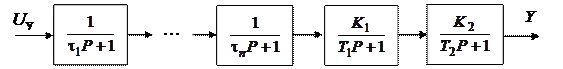 Выполняется после структурно-параметрической декомпозиции объекта управления. Допустим, в результате структурной декомпозиции объекта управления выделен подобъект, структурная схема которого приведена на рис. 5.13. Этот объект управления содержит 2 апериодических звена 1-го порядка с большими постоянными времени (БПВ) T 1 и T 2 и n звеньев с малыми постоянными времени (МПВ) t1 … t n, причем t i << T 1, T 2, i = 1… n.