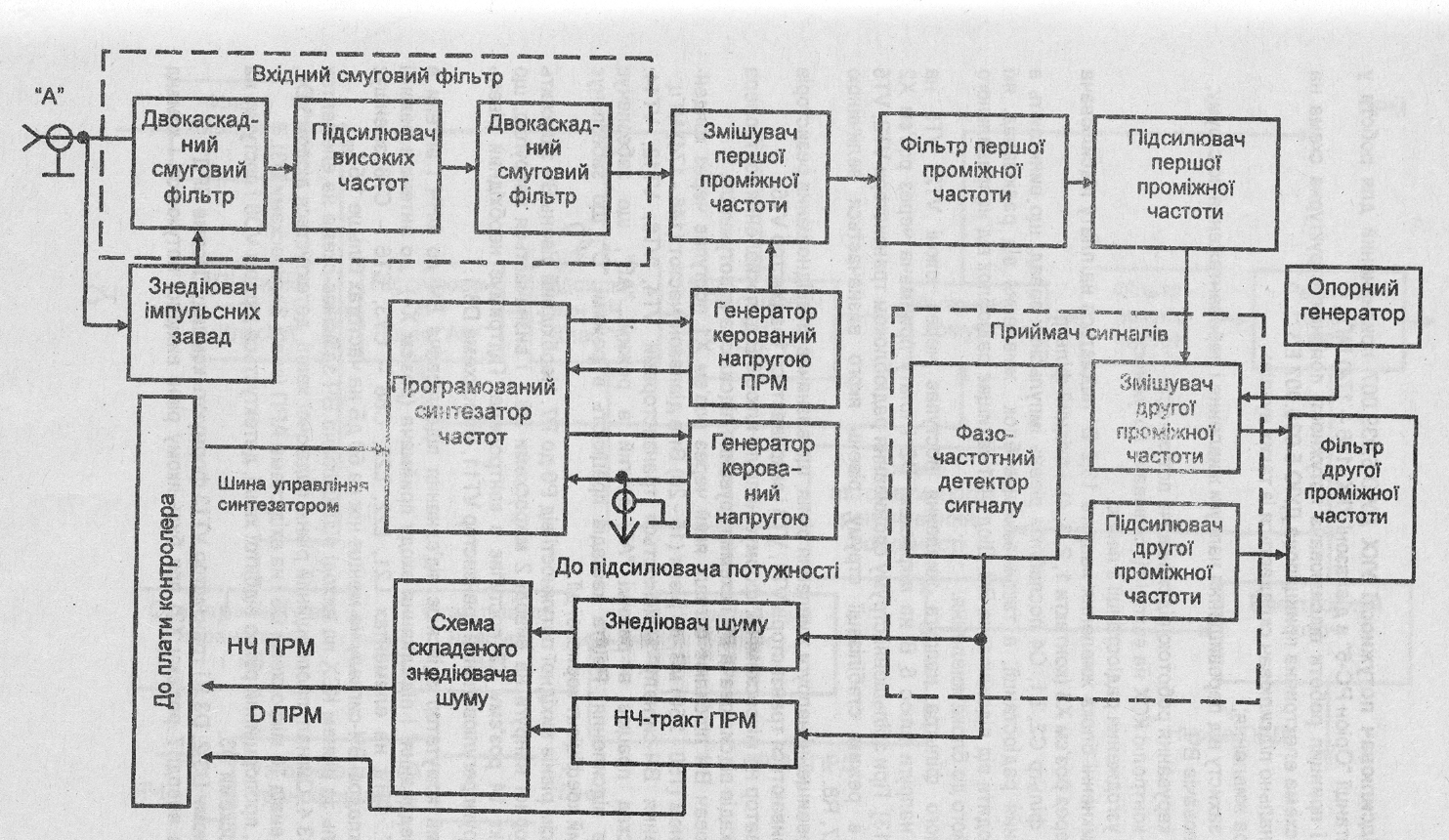 Вхідний смуговий фільтр забезпечує вибірковість приймача за побічними та дзеркальними каналами. До складу преселектора входять фільтри L1, С7, L2, С13, LЗ, С25,L4, С27, підсилювач високої частоти VТ4, обмежувач на діодах VD1. Змішувач виконаний на транзисторі VТ9. На перший затвор подається сигнал від преселектора. На другий затвор подається сигнал від ГКН. Навантагою змішувача є контур L5 С38, налаштований на частоту першої проміжної частоти (fпч = 21,4 МГц). Гетеродин виконаний на транзисторі VТ18 і являє собою ГКН з ємнісною триточкою. ГКН настроєний на частоти f1 = 23,530 МГц та f2 = 23,550 МГц, які - відповідають робочим частотам fp1 = 2,130 МГц та fр2 = 2,150 МГц. Перемикання частот відбувається за допомогою синтезатора частот на мікросхемі D2 (UМА 1018). До складу СЧ входять кварцевий резонатор ZQ2, кола ФАПЧ. Синтезатор частот в залежності від частоти, на якій працює радіостанція, видає відповідну напругу керування (від 0,5 В до 4,5 В) на ГКН. Тракт першої проміжної частоти на елементах ZL1, ZL2, VТ13 забезпечує подавлення другої дзеркальної частоти (fн= 910 кГц) і частково частот сусідніх каналів. Подавлювач шуму призначений для закриття тракту низької частоти приймача при відсутності сигналу на його вході або при великих завадах. Це захищає оператора від шумів. Сигнал на вхід подавлювача шуму поступає від мікросхеми D1 через ФВЧ С116, R112, С117, С119, R114. На мікросхемі D3.2 виконаний підсилювач. З його виходу сигнал поступає на детектори шуму на мікросхеми D3.3 та D3.4. З виходу D4.2 об'єднаний та підсилений сигнал поступає на компаратор D4.3, на виході 8 якого при відсутності корисного сигналу буде рівень "ЛОГ. 0". При наявності НЧ сигналу (рівень "ЛОГ. 1) вмикає ключі D5.2, D5.3 та D5.4 і НЧ сигнал проходить в тракт приймання на платі контролера. На мікросхемі D4.4 побудований подавлювач шуму, який працює по рівнях, які встановлюються з пульта керування. Вибір рівня визначається шумовою ситуацією, в якій працює радіостанція. Подавлювач імпульсних завад виконаний на мікросхемі D6. Подавлювач імпульсних завад призначений для закриття тракту приймання в момент, коли на приймач діє імпульсна завада. До складу подавлювача імпульсних завад входять підсилювачі на транзисторахVТ1 та VТЗ. Транзистори VT5, VT8, VT10 формують блокувальний імпульс при поступленні на вхід приймача додатніх імпульсів, а транзистори VT11, VT12- від'ємних. Транзистори VT2 та VТ7 закривають тракт на момент дії блокувального імпульса. На транзисторі VT15 виконано ГКН, в якому формується подвоєна частота передавання (fпрд1 = 4,260 МГц, fпрд2= 4,300 МГц). Через резистори R77, R79, R80, конденсатор С82, варікап VD4 подається НЧ сигнал з контакту 24 роз'єму ХЗ. Дані сигнали в базі VT15 модулюються і подаються в тракт передавання плати підсилювача потужності через роз'єм Х2. Для живлення всіх вузлів плати приймача використовується стабілізатор напруги на мікросхемі D7 та транзисторах VТ22, VТ23, VT24.