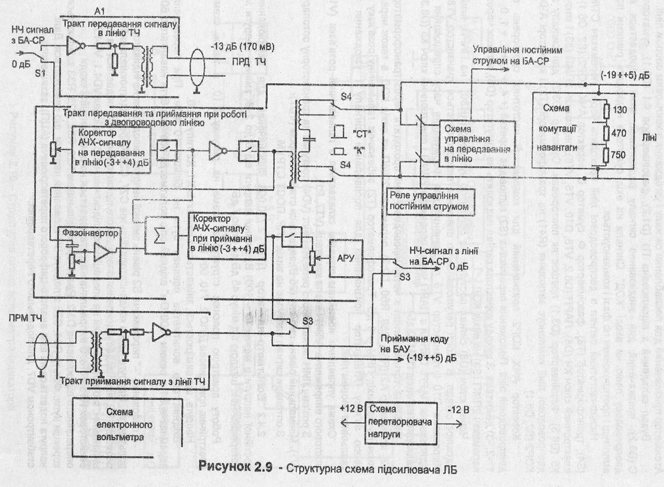 10 Лінійний блок 10.1 Підсилювач лінійного блоку Підсилювач призначений для корекції АЧХ НЧ-сигналів, спотворених ЛДС в режимах "Приймання" і "Передавання" і покращення ' завадостійкості радіостанції при прийманні команд управління з ЛДС. Схема електрична принципова підсилювача приведена в додатку. Склад підсилювача приведений в структурній схемі на рисунку 11. До складу підсилювача входять: - тракт передавання НЧ-сигналів в двопроводову ЛДС; - тракт передавання НЧ-сигналів з двопроводової ЛДС; - тракт передавання НЧ-сигналів в чотирипроводову ЛДС (канал ТЧ); - тракт передавання НЧ-сигналів з чотирипроводової ЛДС (канал ТЧ); - вузол управління постійним струмом. Тракт передавання НЧ-сигналів в двопроводову ЛДС здійснює передкорекцію АЧХ, підсилення і узгодження НЧ-сигналів, які надходять з блоку БА-6. Низькочастотний сигнал з блока БА-6 рівнем 0 дБ надходить на перемикач 2П/ЧП (S3), який під'єднує двопроводову або чотирипроводову лінії зв'язку. Регулятором (R8) забезпечується регулювання коефіцієнта передавання тракту. З виходу регулятора сигнал надходить на коректор АЧХ тракту передачі КОР1 (S1, D1.1). Положення перемикача (S1) відповідають корекції (+ 4, + 3, + 2, + 1,0, мінус 1, мінус 2. мінус 3) дБ/октава. З виходу коректора через електронний ключ К2 (D4) сигнал надходить на вхід вихідного каскаду ВК (D5, VT2,VТЗ). Вихідним каскадом забезпечується підсилення сигналу до рівня, необхідного для передавання в двопроводову лінію зв'язку. Трансформатор ТЗ забезпечує гальванічну розв'язку з лінією зв'язку, а також узгодження вихідного і вхідного опорів підсилення з хвильовим опором лінії зв'язку. У вимкненому положенні перемикача СТ/КАБ (S4) опір навантаження повинен бути 600 Ом, при ввімкненому - 480 Ом. При ввімкненому положенні перемикача 2П/4П (S3) сигнал через атенюатор А1 (R29, R36, R35, D2.1) і трансформатор Т1 поступає в чотирипроводову лінію зв'язку. Атенюатор призначений для послаблення сигналу і узгодження з хвильовим опором лінії. Вузол складений з підсилювача П1 (D1.2), фазоінвертора Ф1 (D3.1), суматора С (D3.2), призначений для знедіювання сигналу радіостанції, який передається в двопроводову лінію на вході "КОД". Сигнали на вхід суматора надходять з рівними амплітудами і протилежними по фазі, за рахунок чого компенсуються. Низькочастотний сигнал з двопроводової лінії проходить через перемикач СТ/К (SЧ), трансформатор (ТЗ), фазоінвертор Ф, суматор С, коректор АЧХ КОР2 (S2, D6.1), електронний ключ КЧ (D8), ПАРП (D6.2, VT8, D10, VT5, VТ6), перемикач 2П/4П (33) і ключ К5 (D8.3). Фазоінвертор (D3.1) працює як повторювач. Суматор (D3.2) для сигналу з двопроводової лінії компенсує згасання (R41) на трансформаторі (ТЗ) і коректорі АЧХ К0Р2 (S2, D6.1). Коректор АЧХ К0Р2 призначений для компенсації частотних спотворень в двопроводовій лінії. Положення перемикача (S2) відповідає корекції (+ 4, + 3, + 2, + 1, 0,-1, -2, -3) дБ/октава. З виходу коректора сигнал надходить на комутатор (D8), а також через перемикач 2П/4П (S3) на вихід "КОД". Через ключ (D8) сигнал поступає на регулятор чутливості (R80) і на ПАРП, який підсилює сигнал. В якості регулювального елемента використовується транзистор VТ8. Мікросхема D10 і транзистор VТ6 призначений для формування часу спрацювання і відновлення ПАРП. Сигнал з ПАРП через перемикач 2П/4П і електронний ключ К5 (D8.3) надходить на вихід ПРМ (0 дБ). Низькочастотний сигнал з чотирипроводової лінії проходить через трансформатор Т2,