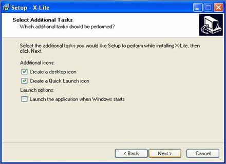 Здесь Вы можете выбрать, куда поместить ярлык программы: Create a desktop icon (на рабочий стол) Create a Quick Launch icon (в панель быстрого запуска) Также можно добавить программу в автозагрузку, если поставить галочку в пункте «Launch the application when Windows start» (Запускать программу при загрузке Windows). Выбрав необходимые Вам настройки, нажмите на кнопку «Next >».