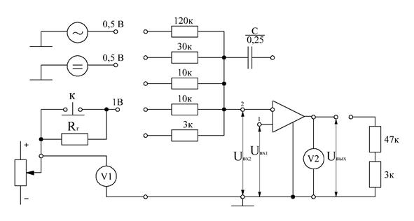 Цель работы: ознакомление с параметрами и характеристиками операционного усилителя и его применением в усилителях, компараторах, сумматорах и генераторах. Описание лабораторной установки. Макет лабораторной установки для исследования операционного усилителя (рис. 6.1) состоит из: - операционного усилителя типа К140УД1Б; - конденсатора и резисторов, предназначенных для образования цепей обратной связи и нагрузки; - источника переменного синусоидального напряжения (действующее значение напряжения 0,5 В); - источника постоянного напряжения (0,5 В); - источника постоянного регулируемого напряжения (±1 В); - вольтметра, измеряющего выходное напряжение.