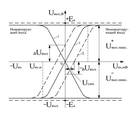 Рис. 6.2. Передаточная характеристика идеального (1) и реального (2) ОУ