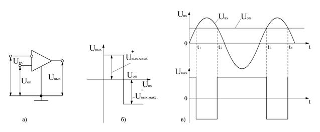 Рис. 6.8. Схема компаратора на ОУ (а), его передаточная характеристика (б) и временные диаграммы (в)