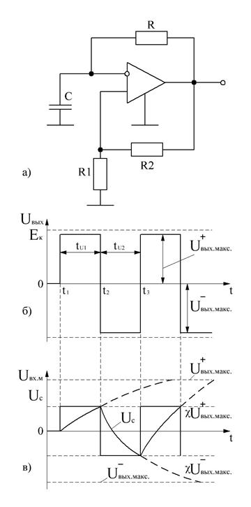 На прямой вход ОУ подается опорное постоянное напряжение положительной или отрицательной полярности Uоп, на инвертирующий вход переменное Uвх, При достижении входным напряжением уровня Опорного напряжения происходит изменение полярности выходного напряжения. Выходное напряжение компаратора имеет вид прямоугольных импульсов, ширина которых зависит от уровня опорного напряжения. На рис. 6.9 приведена схема симметричного мультивибратора на ОУ. Ее основой служит компаратор на ОУ с положительной обратной связью. На интервале времени 0…t1 напряжение питания равно 0, конденсатор С разряжен, Uc = 0, Uвых = 0 (рис. 6.9, б, в). При включении источника питания в момент времени t1, Uвых станет положительным (или отрицательным, процесс случайный). По цепи ОС (R1, R2) приращение выходного напряжения передается на прямой вход ОУ, усиливается им и вновь подается на прямой вход ОУ и т. д. Процесс развивается лавинообразно и заканчивается, когда Uвых достигнет значения Uвых макс. Конденсатор С начнет заряжаться с постоянной времени τ = RC. Напряжение на нем Uc стремится к значению
