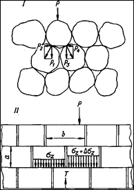 Наряду с моделями сплошных сред для описания деформирования массивов горных пород используют модели дискретных сред. В этом случае среду представляют в виде совокупности отдельных частиц, каждая из которых, взятая в отдельности, обладает всеми свойствами твердого тела. Вместе с тем силы сцепления между отдельными частицами отсутствуют вообще, либо настолько малы, что ими можно пренебречь Вследствие этого дискретные среды не воспринимают растягивающих усилий, что резко отличает их от твердых сплошных тел. В то же время дискретные среды, так же как и твердые тела, способны воспринимать сжимающие нагрузки и по характеру передачи усилий от одной частицы к другой могут быть подразделены на распорные и безраспорные. В первом случае (рис. 1.3, I) каждая частица ведет себя внутри массива как клин, в силу чего при воздействии внешней вертикальной нагрузки внутри массива возникают горизонтальные составляющие усилия. Во втором случае распора в среде не возникает, поскольку каждая частица передает нижележащим частицам только вертикальные усилия (рис. 1.3, II). Важной особенностью дискретных сред и отличием их от сплошных сред является то обстоятельство, что под нагрузкой отдельные её элементы в большей