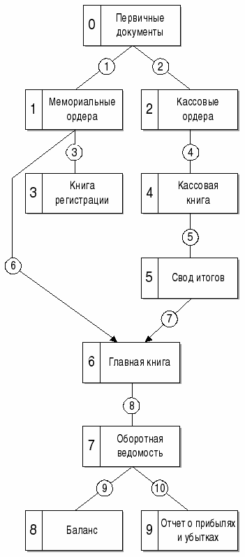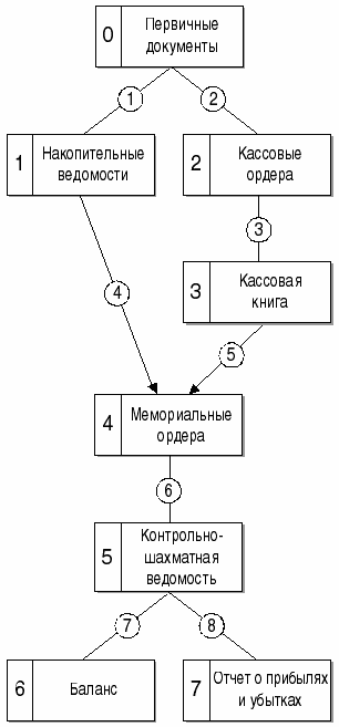 Но Чербони не дожил до этих времен. И, может быть, есть некий скрытый смысл в том, что он умер не когда-нибудь, а в столь памятный для нас, россиян, день — 7 ноября 1917 года. Не пережил! Дата публикации: 22.06.2004 Мы продолжаем публикации очерков об исторически сложившихся формах счетоводства. На этот раз постоянный автор рубрики Я. В. Соколов, д. э. н., профессор, член Методологического совета по бухгалтерскому учету при Минфине России, рассказывает о чисто русской, несмотря на западное происхождение многих ее элементов, форме счетоводства — мемориально-ордерной. Основная идея мемориально-ордерной формы счетоводства сводится к тому, что на каждый первичный документ составляется мемориальный ордер, содержащий проводки (контировки), то есть это как бы разрезанный на части журнал регистрации операций новой итальянской формы счетоводства. Второй особенностью мемориально-ордерной формы надо признать то, что все операции, имеющие отношение к Кассовой книге, оформлялись не мемориальными, а кассовыми ордерами, то есть повторялось противопоставление, принятое в немецкой форме счетоводства. Поскольку мемориальные ордера представляли собой отдельные листы, а их за отчетный период накапливалось множество, то вводилась книга регистрации ордеров (иногда называлась ордерная книга). Ее цель сводилась не к накапливанию оборотов, а к контролю полноты выписываемых документов. В ней писали дату и номер ордера (иногда повторяли проводки и обороты по ним). Основная цель этой книги сводилась к тому, чтобы бухгалтер не потерял, не пропустил какой-то ордер. Кассовые ордера не регистрировались в этой книге, так как они отражались в специальной Кассовой книге. Далее предполагалась разноска операций в Главную книгу. Ее вели по-разному. Изначально самым распространенным вариантом был «самолетик» итальянской формы, то есть на каждый разворот Главной книги открывался отдельный счет: на левой странице фиксировались дебетовые обороты, на правой — кредитовые. При этом предполагалась запись данных из всех мемориальных ордеров, но кассовые ордера в этом случае во внимание не принимались, так как по ним делалось специальное обобщение данных Кассовой книги, и уже общей проводкой в разрезе корреспондирующих счетов итоги переносились в Главную книгу. Таким образом, в этой книге формировались записи по каждому мемориальному ордеру и сразу же обобщенные итоги Кассовой книги. По окончании отчетного периода составлялась оборотная ведомость, данные которой позволяли заполнить баланс и отчет о прибылях и убытках. Однако с самого возникновения формы была сделана попытка заполнять Главную книгу в виде шахматной оборотной ведомости, от чего мемориальную форму счетоводства иногда называли контрольно-шахматной. Все сказанное можно представить в виде следующей схемы (см. схему 1). Из схемы 1 видно, что данные первичных документов (блок 0) фиксируются бухгалтером (записи 1 и 2) в мемориальных (блок 1) и кассовых (блок 2) ордерах. В целях контроля сохранности мемориальных ордеров они регистрируются (запись 3) в специальной книге (блок 3). Данные кассовых ордеров фиксируются (запись 4) в Кассовой книге (блок 4). За отчетный период итоги Кассовой книги обобщаются (запись 5) в специальном своде (блок 5). Далее данные каждого мемориального ордера (запись 6) и «итого» Кассовой книги (запис