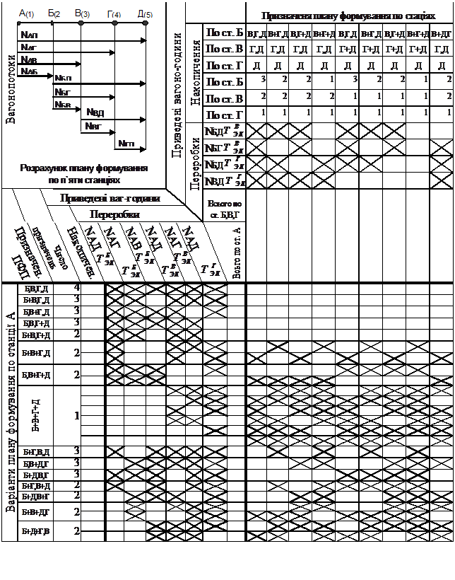 Рисунок 8.12 – Розрахункова форма плану формування методом абсолютного розрахунку Спочатку розробляють план формування одногрупних поїздів. Потім обирають призначення вагонопотоків, для яких потрібно перевірити доцільність організації групових поїздів. По варіантах формування тих чи інших поїздів намічають конкурентоспроможні варіанти плану формування групових поїздів замість одногрупних. Поїзди без постійної ваги груп та не прикріплених до визначеної нитки розкладу найбільш поширені на практиці, але потребують більш чіткої інформації для підготовки груп до заміни на попутних технічних станціях. На станціях причіпки груп до транзитної частини (ядру) можуть бути причеплені групи вагонів не тільки того ж самого призначення, але й інших попутних. Розглянемо методику формування групових поїздів на прямолінійному напрямку з трьома технічними станціями А, Б та В. Спочатку визначаються варіанти одногрупних поїздів (рисунок 8.13).