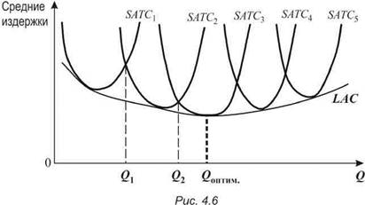 Долгосрочные издержки В долгосрочном периоде все издержки являются переменными, так как фирма может изменить все свои ресурсы, включая производственные мощности. Однако, увеличивая производственные мощности, фирма просто переходит на новый фиксированный их объем (уровень). Определенный фиксированный уровень производственных мощностей определяет масштаб производства. Не следует путать масштаб производства и объем производства: масштаб производства может быть выражен соответствующей кривой краткосрочных средних издержек ATC, объем производства Q представлен координатой какойлибо точки на любой из этих кривых (рис. 4.6). Чтобы правильно и быстро определить эффективный масштаб производства, используют кривую долгосрочных средних издержек LAC. Буква “ L ”означает что речь идет о долгосрочном (long run) периоде. Эффективный масштаб производства обеспечивает возможность производить оптимальный объем производства. Оптимальный объем производства – это объем производства, при котором средние издержки минимизируются. Кривую LAC называют также кривой выбора фирмы: фирма выбирает эффективный масштаб производства, который дает возможность производить оптимальный объем производства (Q оптим. на рис. 4.6 можно произвести с наименьшими средними издержками, только достигнув эффективного масштаба производства SATC 3). Однако фирма, как правило, достигает эффективного масштаба не сразу при создании, а постепенно, последовательно увеличивая объем и соответственно масштаб производства. По мере увеличения масштаба деятельности фирмы происходит переход с одной кривой краткосрочных средних издержек на другую. Кривая LAC строится как огибающая кривая ко всему множеству кривых краткосрочных средних издержек (рис. 4.6).
