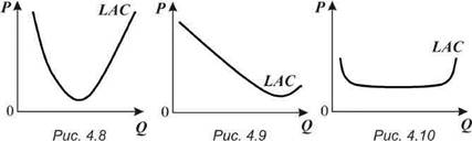 Точка на кривой LAC, соответствующая Q0 характеризует минимально эффективный масштаб производства, где исчерпывается экономия от масштаба и начинается постоянная отдача от масштаба. Q 0 представляет, следовательно, минимальный объем производства, при котором фирма может минимизировать издержки производства. Но существуют и другие кривые. Форма кривых долгосрочных средних издержек может подсказать ответ на вопрос, какие по масштабу фирмы преобладают в данной отрасли (кривые LAC на рис. 4.8, 4.9, 4.10)