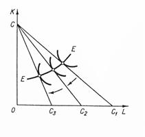 Общий результат изменения цены ресурса может быть разложен, как и в теории потребления, на две части, одна из которых представляет эффект замены, вторая- эффект выпуска. Последняя соответствует эффекту дохода в теории потребления. Разложение общего результата изменения цены переменного фактора на эффект замены и эффект выпуска представлено на рис. 3.6. При цене переменного ресурса w1 изокоста занимала положение СС 1.После повышения цены до w2 она заняла положение СС 2. Общая сумма затрат на ресурсы не изменилась (точка С на оси ординат сохранила свое положение). В результате оптимальная комбинация ресурсов сместилась из точки Е1 в точку Е2. Общий результат повышения цены переменного ресурса выразился в сокращении объема его применения с L1 до L 2.