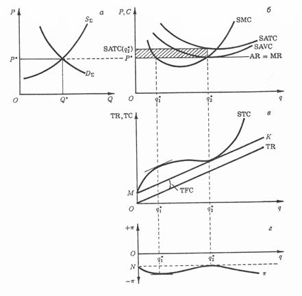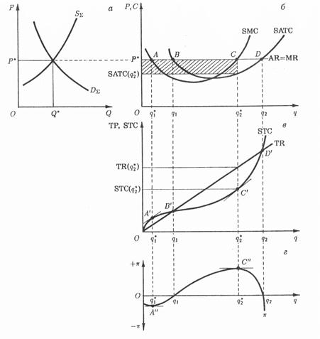 В теории рынков понятия периодов несколько уточняются. Мы можем дать им следующие определения. Мгновенным периодом называется столь короткий период, что выпуск каждого предприятия и количество предприятий в отрасли фиксировано. Коротким периодом называется такой период, в течение которого производственные мощности каждого предприятия (размеры и число заводов, фабрик, других производственных единиц) фиксированы, но выпуск может быть увеличен или снижен за счет изменения объема использования переменных факторов. Общее число предприятий в отрасли остается неизменным. Длительным периодом называют такой период, в течение которого производственные мощности могут быть приспособлены к условиям спроса и затрат. В предельном случае (если условия деятельности совершенно неблагоприятны) предприятие может полностью прекратить деятельность (уйти из отрасли или с рынка). С другой стороны, новые предприятия могут войти в отрасль (на рынок) в случае благоприятных рыночных условий. Таким образом, число предприятий в однородной отрасли в длительном периоде может варьировать. В условиях совершенной конкуренции предприятие является ценополучателем. Оно может максимизировать свою прибыль, лишь приспособив объем выпуска к условиям товарного рынка, с одной стороны, и/или к обусловленным технологией собственным затратам — с другой. Но оно не может оказать влияние на цену продукции. Определим выпуск, обеспечивающий максимум прибыли совершенно конкурентного предприятия при заданных условиях рынка и технологии. Заметим лишь предварительно, что экономисты называют максимумом прибыли как максимум положительной разницы между выручкой и затратами производства продукции, так и минимум отрицательной разности между теми же величинами. Поэтому минимум убытков может рассматриваться как максимум прибыли, если получить положительную прибыль невозможно. Пусть условия товарного рынка таковы, как показано на рис. 4.2, а, где D∑ и S∑ — рыночные кривые спроса и предложения; Р* и Q* — соответственно рыночная цена равновесия и равновесный объем выпуска (продаж) отрасли в единицу времени. Пусть, далее, кривые SMC, SATC и STC на рис. 4.2, б, в представляют кривые предельных, средних общих и общих затрат типичного предприятия в коротком периоде. Поскольку предприятие является ценополучателем, линия AR = MR на рис. 4.2, б является линией спроса на продукцию предприятия, тогда как луч TR на рис. 4.2, в — линия его общей выручки. Наклон линии TR неизменен на всем ее протяжении, поскольку цена не зависит от объема выпуска данного предприятия, и потому TR = P*q. Прибыль предприятия представляет разность между общей выручкой и общими затратами короткого периода: π(q) = TR(q) – STC(q).