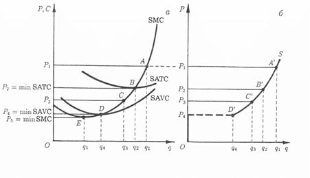 зависимость величины предложения от данного товара. Можно показать, что кривая предложения совершенно конкурентного предприятия в коротком периоде тождественна части его кривой предельных затрат. На рис. 4.4, а представлены кривые предельных (SMC). Средних общих (SATC) и средних переменных (SAVC) затрат. При цене Р1 максимум положительной прибыли достигается при выпуске q1; значит, точка А на кривой SMC принадлежит кривой предложения данного прибылемаксимизирующего предприятия. При более низкой цене, Р2, прибыль будет максимальна при выпуске q2; значит, и точка В на кривой SMC принадлежит кривой предложения. Заметим, что в этом случае максимум (положительной) прибыли равен нулю, поскольку цена Р2 равна минимуму средних общих затрат (Р2 = AR = MR = minSATC). Но, с другой стороны, Р3 > SAVC(q3). А это значит, что выручка от продажи выпуска q3 возместит все переменные и, кроме того, часть постоянных затрат предприятия. Таким образом, убытки от выпуска q3 будут меньше, чем сумма общих постоянных затрат (TFC) в коротком периоде. Поэтому по сравнению с нулевым выпуском выпуск q3 будет прибылемаксимизирующим. Следовательно, и точка С принадлежит кривой предложения предприятия. При еще более низкой цене Р4 = minSAVC выпуск q4 удовлетворяет обоим условиям максимизации прибыли. Это значит, что TR(q4) = q4 (SAV C(q4)) = TVC(q4) и, следовательно, убытки предприятия равны сумме постоянных затрат. В этих условиях предприятию безразлично, производить ли q4 единиц продукции или закрыться. Поэтому точку D на
