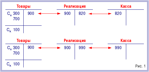 Французы исходили из того, что счет «Товары», по природе своей не материальный, а калькуляционный, и должен вестись по себестоимости, ибо товары — это капитализированные расходы, и весь их учет должен быть посвящен исчислению финансовых результатов. Например, если привезли 100 бутылок и 5 из них были разбиты (или выпиты третьими лицами) в пути, то предлагалось 95 принятых бутылок оценить по стоимости 100 с прибавлением транспортного тарифа. Далее француз И. С. Кине (1814 г.) ввел специальный счет, как его назовут Эжен Леоте (1845–1908) и Адольф Гильбо (1819–1895) — счет порядка и метода. Счет этот и у нас до самых последних лет назывался счетом «Реализации», теперь «Продаж». Это был мост, чисто методологический символ, между счетами «Касса» и «Товары». По дебету счета «Реализация» списывалась себестоимость проданных товаров, по кредиту отражалась выручка, полученная за них. Потом во Франции его назвали счетом-экраном, ибо на нем высвечивают полученный результат. Наши примеры по схеме Кине будут выглядеть так — см. рис. 1. Чтобы делать такие записи надо на каждом чеке писать две цены: за сколько магазин купил товары (900 руб.) и сколько покупатель платит за эти товары магазину (820 руб. или 990 руб.). Покупателей это раздражало, а бухгалтерам прибавляло работы. Но зато финансовый результат от продажи отражался на специальном счете и не смешивался с другими финансовыми результатами (внереализационными и форс-мажорными).