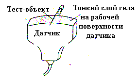 Число элементов в датчиках и связанное с ним число приемно-передающих каналов электронного блока прибора определяет разрешающую способность и влияет на аппаратурные артефакты изображения. Чем больше число элементов и число каналов, тем выше, вообще говоря, качество изображения. Число элементов в датчиках и каналов приема-передачи фирмы-производители указывают далеко не всегда. Вместе с тем, основное значение имеет не столько само число элементов датчика, сколько то, какая их часть от общего количества участвуете формировании УЗ - луча: чем большее число элементов формирует УЗ - луч, тем выше качество изображения. Можно предложить простой тест для определения того, какая часть элементов (или апертуры) датчика формирует УЗ - луч на прием и передачу. После включения прибора и установления на нем В-режима необходимо переключить фокусировку напередачу на самый дальний фокус. Далее следует смочить поверхность датчика водой или покрыть ее тонким слоем геля. После этого надо приложить к рабочей поверхности тонкий металлический предмет (толщиной не более 1-2 мм), например спицу, булавку, разогнутую скрепку, тонкую отвертку и т.д. Ось предмета (тест-объекта) должна быть ориентирована перпендикулярно плоскости сканирования, а начальное положение тест-объекта - середина рабочей поверхности датчика (рис. 5.2).