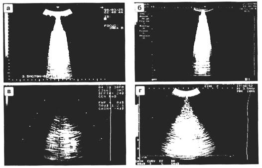 При 32 каналах на прием-передачу и 128 элементах в датчике в формировании луча участвует 1/4 часть элементов датчика и набольшой дальности засвечивается 1/3 ширины изображения (рис. 5.3,б). При 48 и более каналах в датчике засвечивается не менее 1/2 ширины изображения (рис. 5.3,в, 5.3,г). Чем большее число каналов имеется в приборе, тем большая часть ширины изображения засвечивается при работе с тест-объектом и тем лучше, как правило, поперечная разрешающая способность прибора. С помощью элементарного тест-объекта можно также быстро проверить работоспособность всех каналов прибора и элементов датчика. Для этого надо медленно вести тест-объект вдоль рабочей поверхности датчика от одного края датчика к другому, сохраняя ориентировку оси тест-объекта перпендикулярной плоскости сканирования. При этом засвеченная часть изображения будет перемещаться по эхограмме, отслеживая перемещение тест-объектa по поверхности датчика. Если прибор исправен, засвеченная часть не изменяется по своему виду в процессе перемещения тест-объекта и только обрезается на краях зоны обзора. Изменение вида засвеченной области или вообще исчезновение акустических строк при некоторых положениях тест-объекта свидетельствует о неисправности каналов прибора или элементов датчика.