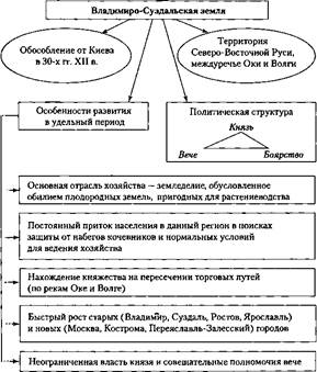 Упадок торговли по Днепру вследствие половецкой опасности и утраты Византией своего мирового торгового значения Рост городов на Руси как центров удельных земель ритории и ослаблению власти киевского князя. На процесс непрерывного дробления страны могло повлиять и отсутствие в русском феодальном праве понятия о майорате. Этот принцип, существовавший во многих государствах Западной Европы, предусматривал, что все земельные владения того или иного феодала переходили только к старшему из сыновей. На Руси же земельные владения после смерти князя могли делиться между всеми наследниками. Одним из важнейших факторов, породивших феодальную раздробленность, большинство современных историков считают развитие крупного частного феодального землевладения. Еще в XI в. идет процесс «оседания дружинников на землю», появления крупных феодальных вотчин — боярских сел. Класс феодалов приобретает экономическое и политическое могущество. Наличие большого числа крупных и средних феодальных владений становилось несовместимым с раннефеодальным государством, имевшим огромную территорию и слабый государственный аппарат. Б.А. Рыбаков считает феодальную раздробленность результатом исторической дифференциации и свидетельством зрелости феодализма. Распад Древнерусского государства не разрушил сложившуюся древнерусскую народность. Искусствоведы и филологи отмечают, что духовная жизнь различных русских земель и княжеств при всем своем многообразии сохраняла общие черты и единство стилей. Росли и строились города — центры вновь возникших удельных княжеств. Развивалась торговля, что привело к возникновению новых путей сообщения. Важнейшие торговые пути проходили от оз. Ильмень и р.Западной Двины к Днепру, от Невы к Волге, Днепр также соединялся с Волжско-Окским междуречьем. Таким образом, удельный период не следует рассматривать как шаг назад в русской истории. Однако непрекращающийся процесс политического дробления земель, многочисленные княжеские усобицы ослабляли обороноспособность страны перед внешней опасностью. 2.2. Характеристика основных удельных центров (Владимиро-Суздальская земля, Великий Новгород, Галицко-Волынское княжество) Важную роль в политической жизни Руси играла Владимиро- Суздальская земля (схема 29). На рубеже XII—XIII вв. она охватывала огромные пространства в междуречье Оки и Волги. Эта территория, считающаяся сейчас самым центром России, тысячу лет назад была сонссм малозаселенной. С древности здесь жили финно-угорские племена, впоследствии почти полностью ассимилированные славянами. Рост населения Киевской Руси вызвал необходимость освоения новых Территорий. В XI—XII вв. южные рубежи государства постоянно подвергались набегам кочевников. В это время и начинается интенсивное Передвижение славянских переселенцев в северо-восточный регион. Центром вновь освоенных земель становится г. Ростов (ныне — Ростом Великий).