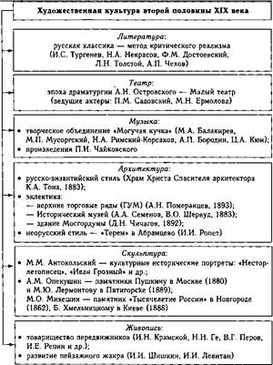 • Н.А. Римский-Корсаков (1844—1908), написавший музыку к операм «Снегурочка», «Майская ночь», «Ночь перед рождеством», «Псковитянка», «Царская невеста», которые с большим успехом идут в российских театрах и до сих пор; • А.П. Бородин (1833—1887) — автор своей единственной оперы «Князь Игорь» и сочинитель нескольких симфоний, являвшийся также ученым-химиком; • Ц.А. Кюи (1835—1918) — крупнейший отечественный специалист по фортификации, инженер-генерал, ставший видным композитором, автор оперы «Сын мандарина», романсов и инструментальных произведений. В «Могучую кучку» не входил П.И. Чайковский (1840—1893), тяготевший к общеевропейским музыкальным формам, хотя, бесспорно, его музыка наполнена национальным колоритом. В мировую классику вошли балеты П.И. Чайковского «Лебединое озеро», «Щелкунчик», ♦Спящая красавица», оперы «Евгений Онегин», «Пиковая дама», многочисленные романсы, симфонические поэмы и т.п. Живопись. В изобразительном искусстве с середины XIX в. утверждается реализм, в котором преобладающим жанром становится социально-бытовой. Этому способствовал раскол в среде русских художников, получивший название «бунт четырнадцати». В ноябре 1863 г. группа выпускников Академии художеств отказалась писать конкурсные дипломные работы на предложенную тему из скандинавской мифологии и покинула учебное заведение. Они объединились в артель и стали жить коммуной. В 1870 г. ими было создано «Товарищество передвижных художественных выставок» по инициативе И.Н. Крамского, Г.Г. Мясоедова, В.Г. Перова, Н.Н. Ге. Передвижники представляли художественное направление, идейно противоположное академизму с его мифологией, парадностью и театральностью. Они хотели изображать реальную жизнь, делая акцент на общественные и психологические проблемы своего времени. Одной из самых ярких фигур среди передвижников был И.Е. Репин (1844—1930), работавший в разных жанрах. Общеизвестны такие его картины, как «Бурлаки на Волге», «Запорожцы, сочиняющие письмо турецкому султану», а также портреты ученых (Н.И. Пирого- ва, И.М. Сеченова), писателей (Л.Н. Толстого, И.С. Тургенева), композиторов (М.И. Глинки, М.П. Мусоргского), художников (И.Н. Крамского, В.И. Сурикова). Значительное место в школе передвижников занимали исторический жанр, основу которого составляли национальные традиции (В.И. Суриков, В.М. Васнецов), а также пейзажная живопись (И.И. Шишкин, А.И. Куинджи, И.И. Левитан и др.). К концу XIX в. влияние передвижников существенно уменьшилось, так как в изобразительном искусстве возникли новые направления. Скульптура. Реалистические традиции в этом виде художественной культуры отразились в близком к передвижникам творчестве М.М. Антокольского (1843—1902), создавшего галерею скульптурных исторических портретов «Нестора-летописца», «Ивана Грозного» (1871), «Петра I «(1872) и др. Монументальная скульптура была представлена в творчестве A.M. Опекушина (1838—1923) — автора памятника А.С. Пушкину, в Москве (1880), открытие которого стало событием огромного культурного значения, а также памятника М.Ю. Лермонтову в Пятигорске (1889). Монументальные памятники были воздвигнуты также по проектам М.О. Микешина (1835—1896): «Тысячелетие России» в Новгороде (1862), Екатерине II в Петербурге, Богдану Хмельницкому в Киеве (1888). Архитектура. На развитие архитектуры второй половины XIX в. основное влияние оказал строительный бум, свя