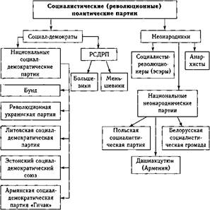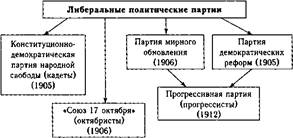Неонародники в целом были довольно активной политической силой и играли важную роль в революционно-социалистическом движении России. Политические партии либеральной ориентации, как правило, формировались в рамках земского представительства (схема 184). Земцы- либералы понимали, что на уровне местного самоуправления им не удастся реализовать программные установки, поэтому они начали создавать политические организации. Первым шагом в этом направлении стало основание и издание за границей (в Штутгарте) нелегального журнала «Освобождение» (июль 1902 г. — октябрь 1905 г.) под редакцией П.Б. Струве. Летом и осенью 1903 г. оформились, соответственно, две либеральные организации «Союз освобождения» и «Союз земцев- конституционалистов», ставшие ядром кадетской партии. Конституционно-демократическая партия (кадеты^организационно оформилась на 1-ом съезде в октябре 1905 г. Кадеты, добавившие в 1906 г. к своему названию словосочетание «партия народной свободы», считали свою организацию надклассовой, соответствовавшей идеалам и традициям русской интеллигенции. Основными положениями партийной программы кадетов были следующие: